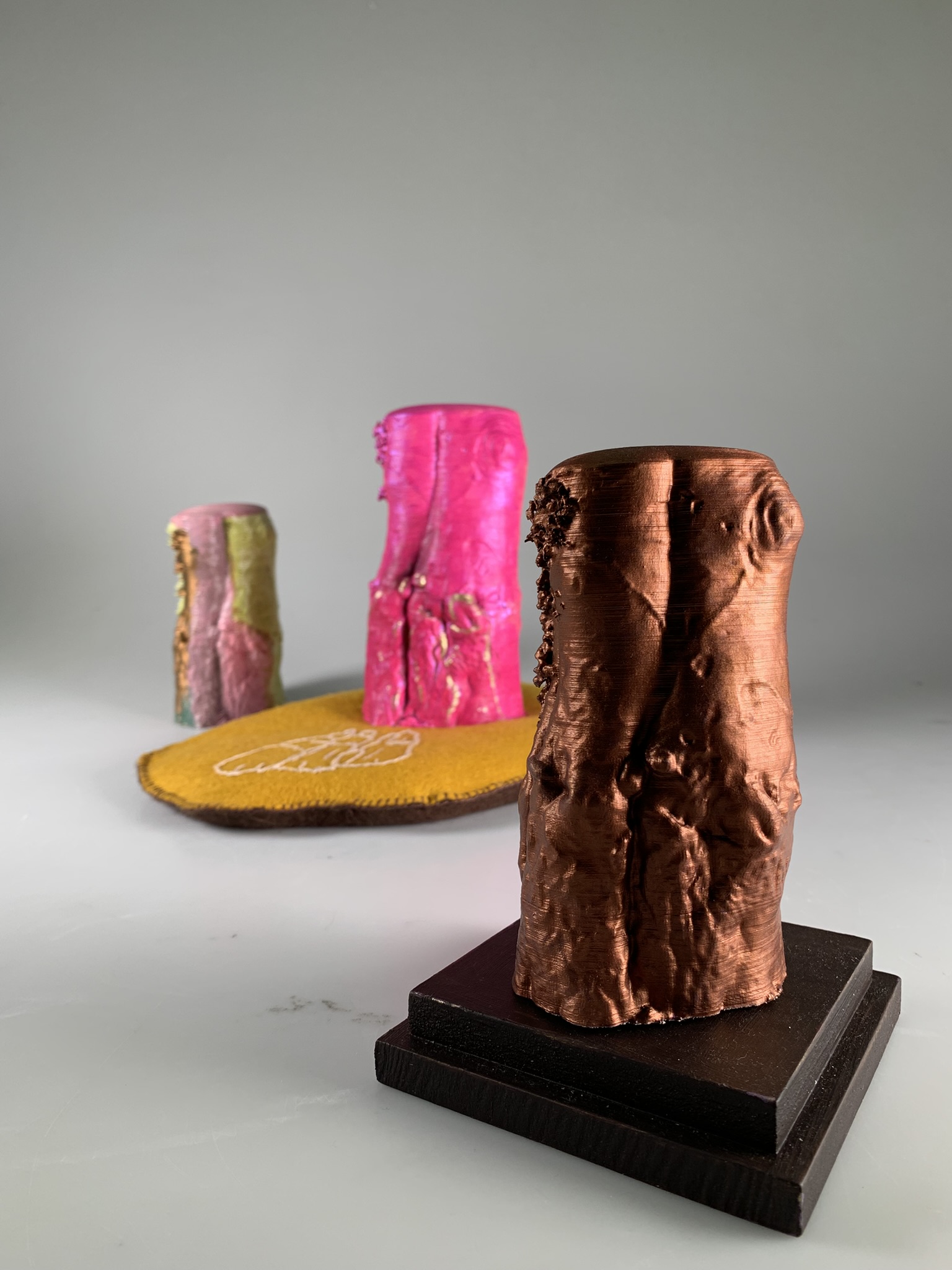 Featuring a large-scale digital collage projection, mixed media sculptures, found objects, and layered atmospheric sound. The work was inspired by a pareidolic moment, when I saw three feminine figures in the bark of a tree. I imagined them to be spiritual symbols, and started thinking about our propensity to commodify the promise of comfort. I reproduced the figures using cheap, fast production methods and displayed them in a fake shop setting. The piece also looks at the cultural elitism that still surrounds decorative art. A mass-produced trinket can mean just as much to someone with limited means as a fine art sculpture can mean to someone wealthy who believes they have perfect taste. This work questions who decides what has value, and why.